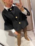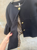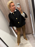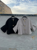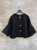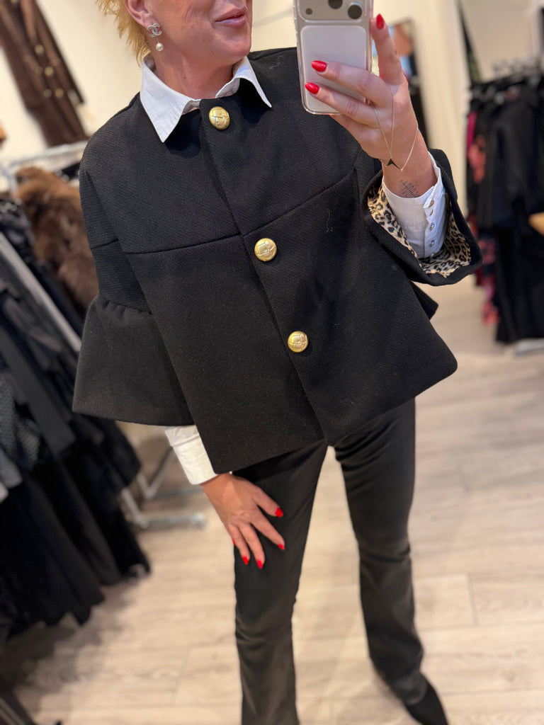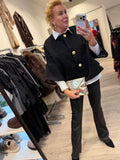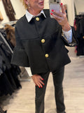 BESKRIVELSE: Smuk kort jakke med mange flotte detaljer. Den har 7/8 lange ærmer og rund hals. Den lukkes med flotte knapper i guldfarvet på fronten. Der er gråt for i jakken.