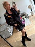 BESKRIVELSE: Flot oversize blazer med snydelommer foran. Der er revir og et enkelt knapluk på blazeren. Blazeren har printet strik og print i fede farver. Der er skulderpuder i blazeren. Der er foer i blazeren.