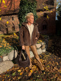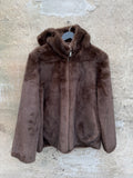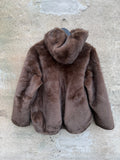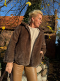 BESKRIVELSE: Smuk pels i vegan, det vil sige ikke ægte pels. Det er en super flot efterligning af ægte pels. Den har lange ærmer og hætte. Den har lommer i siden.