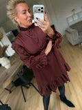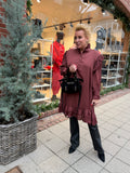 BESKRIVELSE: Festlig satinkjole i oversize model, med flæsdetaljer i bunden, samt ved ærmer, skuldre og krave.