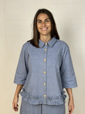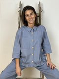 BESKRIVELSE: Fin skjortebluse i kanvas, med smukke guldknapper på åbningen foran.