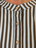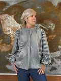 BESKRIVELSE: Luftig skjorte med kinakrave og rund hals. Modellen har stolpe foran med matte guldknapper, som giver et elegant udtryk. De lange ærmer afsluttes med elastik i kanten for en behagelig pasform. Skjorten har små slidser i siderne og runder let i bunden, hvor den er en smule kortere foran end bagpå. På ryggen prydes blusen af et stort, smukt guldsmedebroderi, som tilføjer et unikt og iøjnefaldende detaljer.