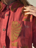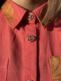 Foran lukkes blusen med smukke guldknapper, som tilfører et elegant touch, og de to rummelige frontlommer – hvoraf den ene prydes af et diskret guldlogobroderi – giver en subtil, eksklusiv detalje. Nederst afsluttes modellen med en smuk flæsekant, der skaber bevægelse og en let, flatterende silhuet. Perfekt til både hverdag og mere dressed outfits.