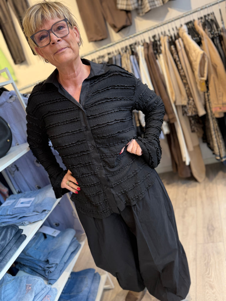 BESKRIVELSE: Smuk bluse / skjorte med krave og lange ærmer med vidde for enden. Den har flotte flæser. Blød lækker kvalitet og nem at style til jeans og andre bukser og nederdel. Den er flot afrundet nederst.