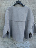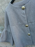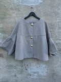 BESKRIVELSE: Smuk kort jakke med mange flotte detaljer. Den har 7/8 lange ærmer og rund hals. Den lukkes med flotte knapper i guldfarvet på fronten. Der er gråt for i jakken.