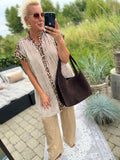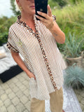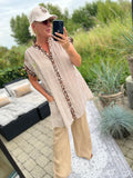 BESKRIVELSE: Sød flot kjole / lang skjorte med et lille kort ærme, V-udskæring og er knappet igennem foran. Der er broderet en guld palm på brystet. Kjolen er let i stoffet og nogen vil tage en underkjole eller body-sæt under.