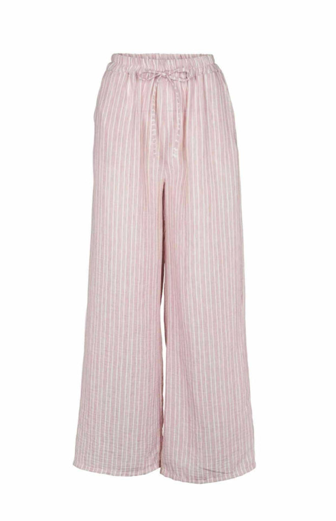 BESKRIVELSE: Smarte bukser i lækker stribet kvalitet. De er vidde i benene og elastik og bindebånd i taljen. Der er også lommer i siden.