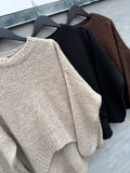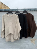 BESKRIVELSE: Skøn strik med rund hals og lange ærmer. Den har flot afrunding nederst og rib i alle kanter.