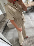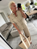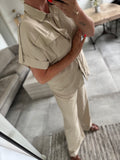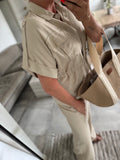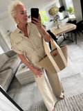 BESKRIVELSE: Super flot sæt med bluse / skjorte og buks i hør kvalitet. Skjorten er med korte ærmer og almindelig krave. Skjorten har skulderstropper med guldfarvet knap og bindebælte i taljen. Bukserne har elastik i taljen og er lige op og ned i modellen.