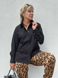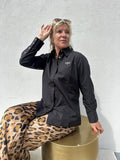Mat guldknap i halsudskæring, samt på ærmer, som har lang åbning, hvilket vil sige du finder fem knapper i lukning. Super fin detalje.
