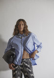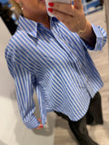 BESKRIVELSE: Klassisk stribet skjorte med rhinsten ned langs knappelukningen. Skjorten har en normal pasform. Modellen langt hår har en str. S på og størrelse M har Helle på (kort hår).