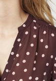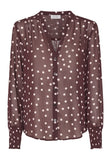 BESKRIVELSE: En prikket skjorte i en gennemsigtig kvalitet. Skjorten har en v-udskæring og lange ærmer med smocksyninger i kanten. Der skal top under, da den er let gennemsigtig.