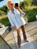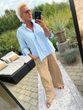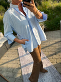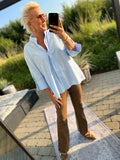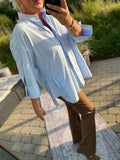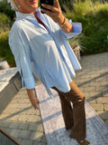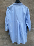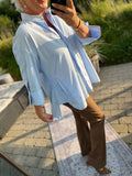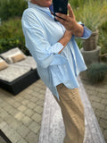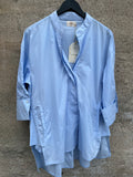 BESKRIVELSE: Lækker lyseblå skjorte med lækre detaljer. Den har 7/8 lange ærmer og er længere bag til.