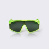 Super cool solbrille designet af Szhirley med neon grønt brillestel og mørkegrønne brilleglas. DroppsBySzhirley logo på brillestang.
