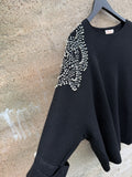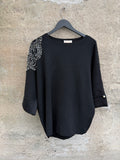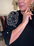 BESKRIVELSE: Lækker vid strik med rund hals og korte ærmer med opsmøg med perle-detalje. Strikken har detaljer med sten og perler på højre skulder.