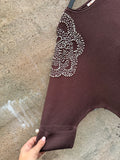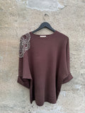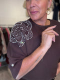 BESKRIVELSE: Lækker vid strik med rund hals og korte ærmer med opsmøg med perle-detalje. Strikken har detaljer med sten og perler på højre skulder.