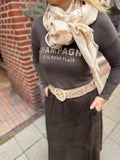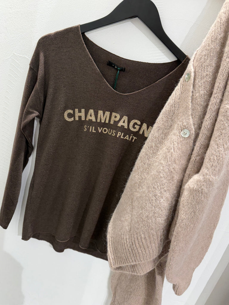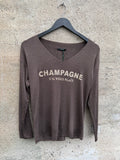BESKRIVELSE: Lækker bluse med rund V hals og lange ærmer. Blusen har tekst på fronten CHAMPAGNE med guldtryk. Den er i en let kvalitet.