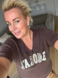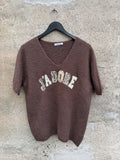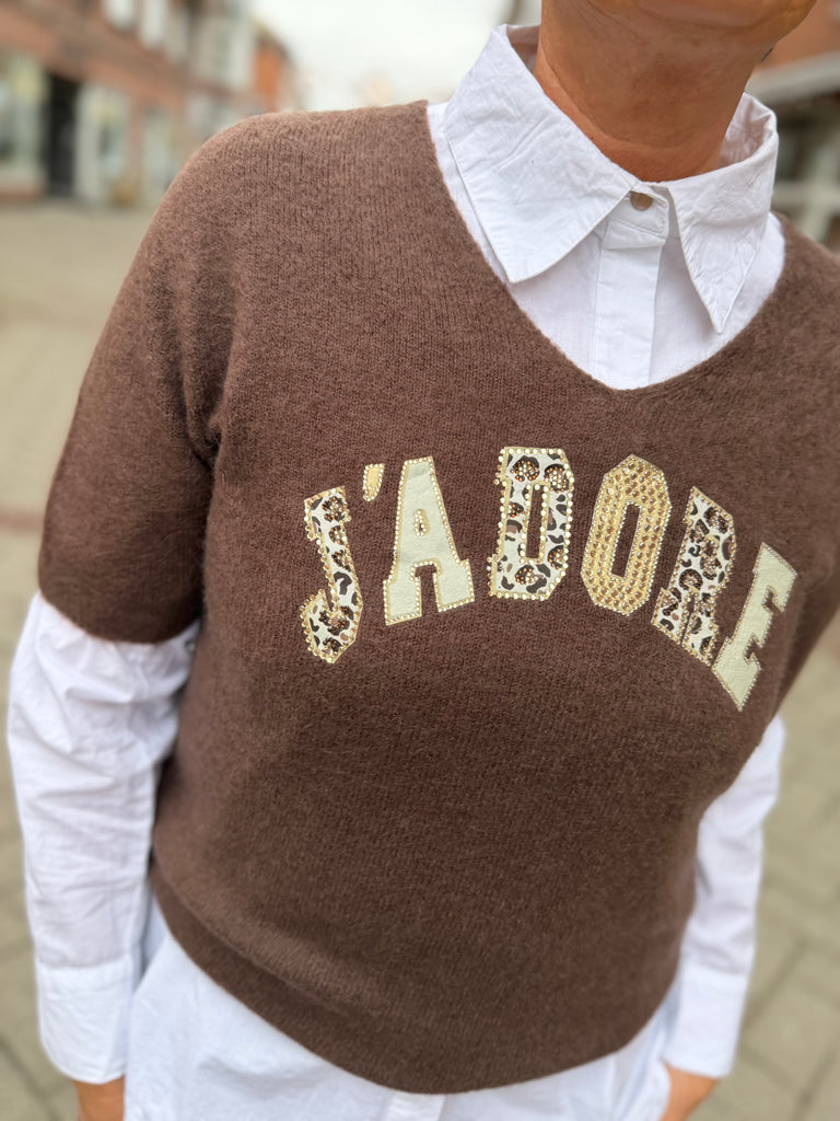 BESKRIVELSE: Lækker strik med V hals og korte ærmer. Strikken har tekst på fronten JADORE med perler, sten og leopard.