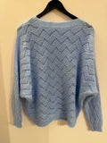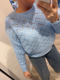 BESKRIVELSE: Smuk strik med lige rund hals og lange raglan-ærmer. Strikket er i mønster, så den er let gennemsigtig. Virkelig fin med top under eller en skjorte.