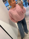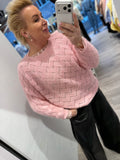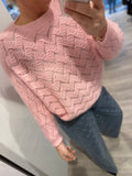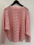 BESKRIVELSE: Smuk strik med lige rund hals og lange raglan-ærmer. Strikket er i mønster, så den er let gennemsigtig. Virkelig fin med top under eller en skjorte.