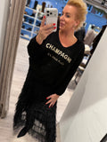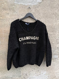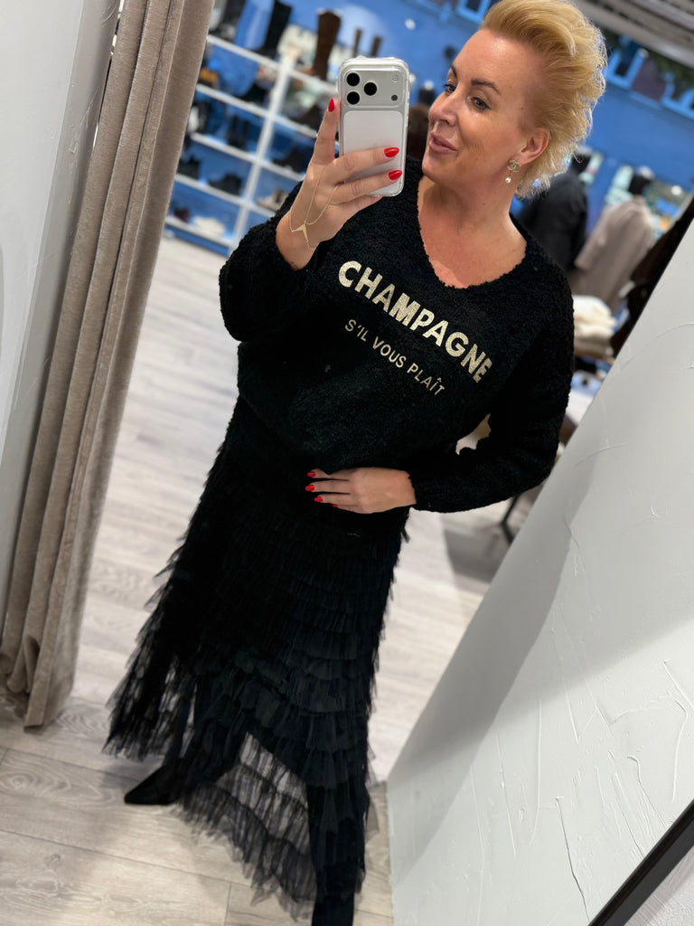 BESKRIVELSE: Lækker bluse med V hals og lange ærmer. Blusen har tekst på fronten CHAMPAGNE med guldtryk.