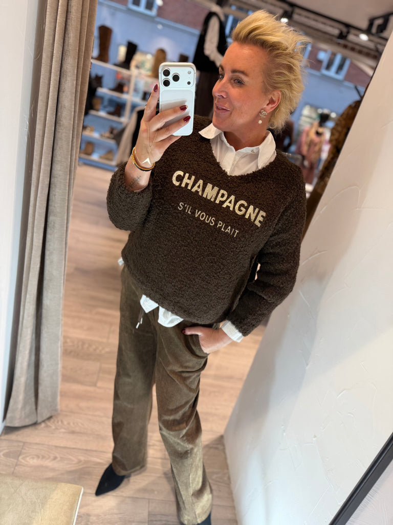 BESKRIVELSE: Lækker bluse med V hals og lange ærmer. Blusen har tekst på fronten CHAMPAGNE med guldtryk.