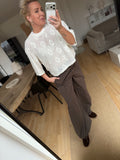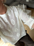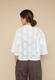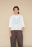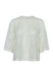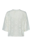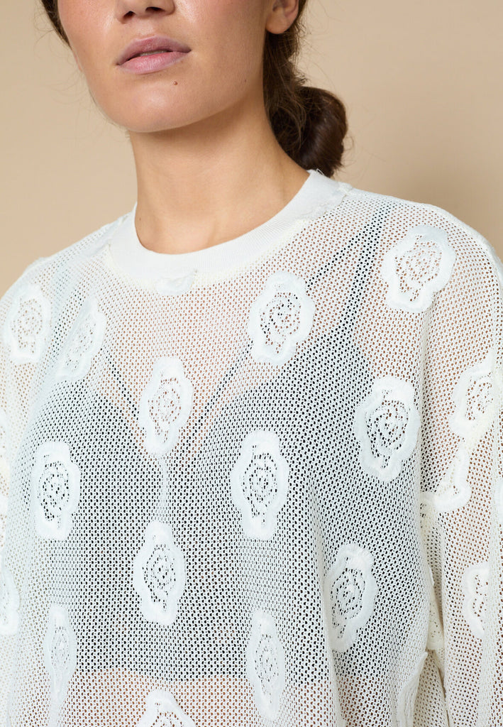 BESKRIVELSE: Love1481 er en kortærmet mesh-bluse med vidde og rund hals. Den har et mønster af teksturerede, blomsterlignende applikationer over det hele. Mesh-strukturen giver en gennemsigtig effekt. Modellen har en str. S på.