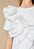 BESKRIVELSE: love1496 er en T-shirt med et markant, asymmetrisk design. Toppen er dekoreret med store, voluminøse flæser ned over den ene skulder og brystet. Modellen har en str. S på