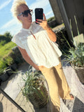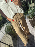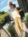 BESKRIVELSE: Flotte løse bukser med elastik i taljen og bindebånd. De har lommer i siden.