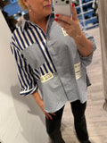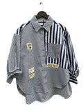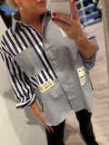 BESKRIVELSE: Smart skjorte med almindelig krave og lange ærmer med manchet. Den har kombi med stof med smalle striber og stof med brede striber. Skjorten har påsyede patches med tekster.