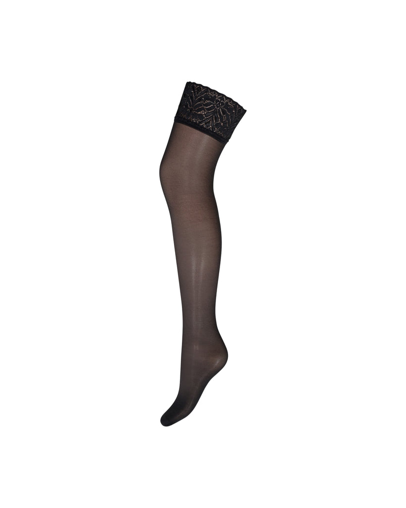 BESKRIVELSE: Selvsiddende strømper med smuk blondekant. De har en silikonekant på 6 cm, der holder dem oppe. 20 denier.