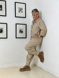 Lige ben, som afsluttes med bred elastik. Den knappes foran og har elastik i taljen bag på. Jumpsuiten har sidelommer og brystlommer, og på ryggen finder du vores logo. Absolut en favorit.