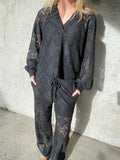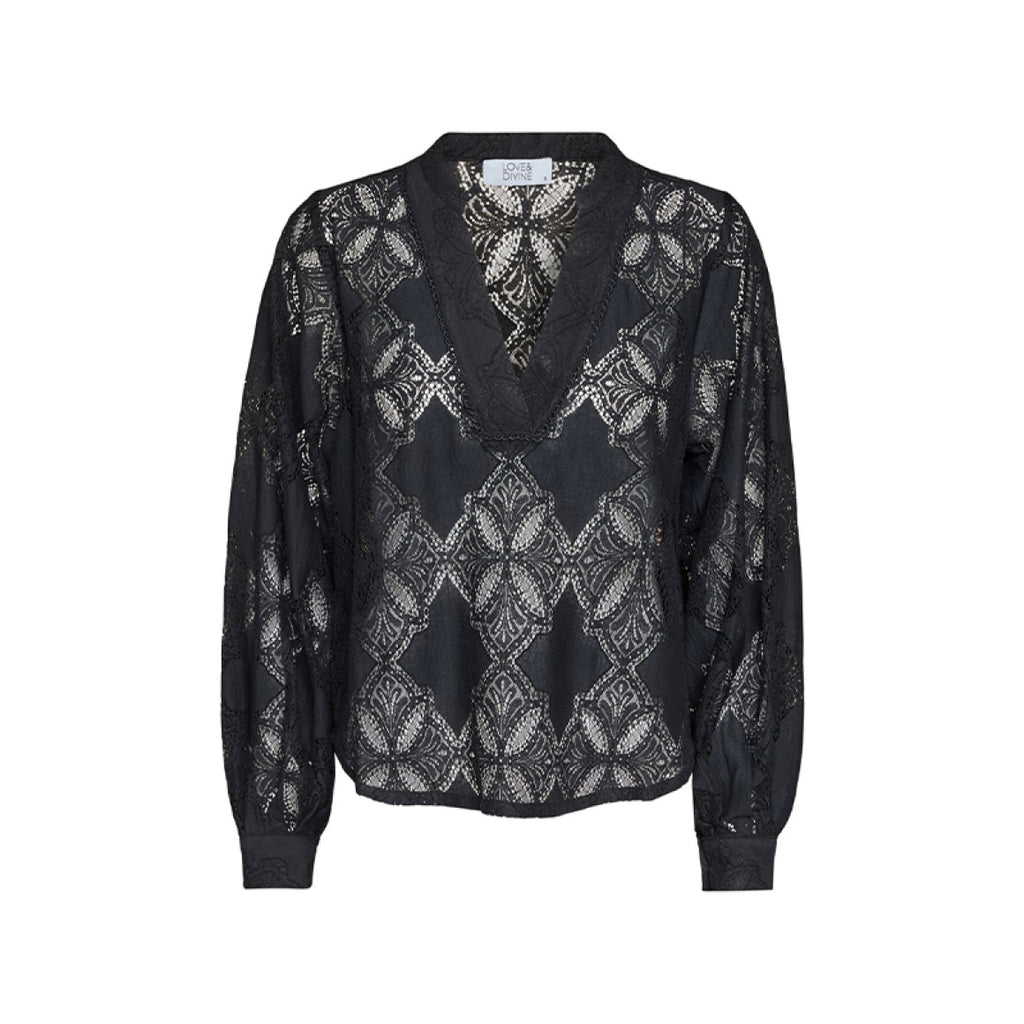BESKRIVELSE: Løstsiddende og feminim bluse med et blonde print. Blusen var en v-hals. Den er gennemsigtig, så der skal top eller lignende under.