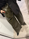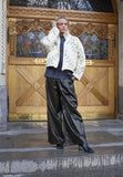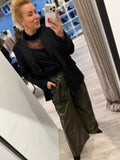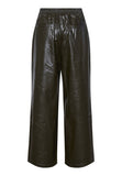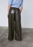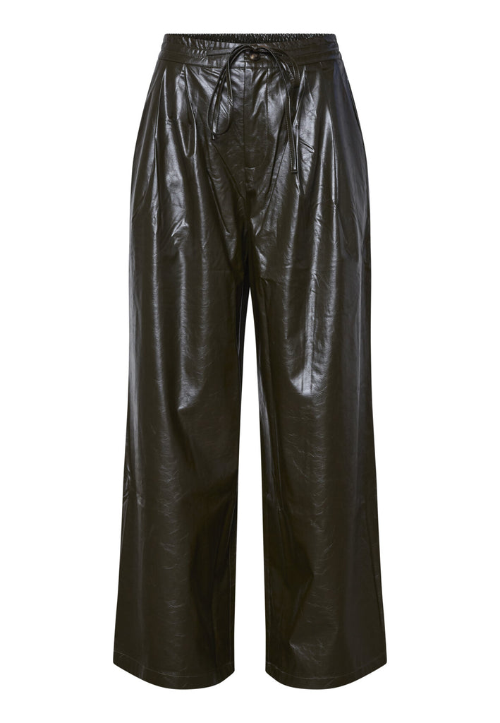 BESKRIVELSE: love1358 er et par vide bukser i immiteret læder med elastik i taljen. Bukserne har plads til bevægelse og har et afslappet udtryk. Modellen med langt hår har en str. S på og er 171 cm høj. Bukserne skal være meget oversized.