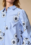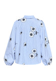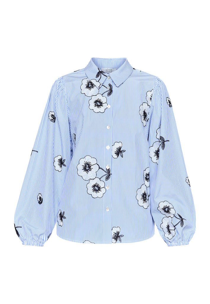 BESKRIVELSE: Love1430-1 er en stribet skjorte med unikt blomster broderi, klassisk krave, knaplukning og voluminøse ærmer. Modellen har størrelse S.