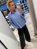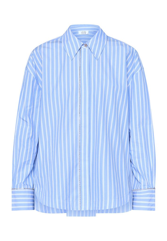 BESKRIVELSE: Klassisk stribet skjorte med rhinsten ned langs knappelukningen. Skjorten har en normal pasform. Modellen langt hår har en str. S på og størrelse M har Helle på (kort hår).