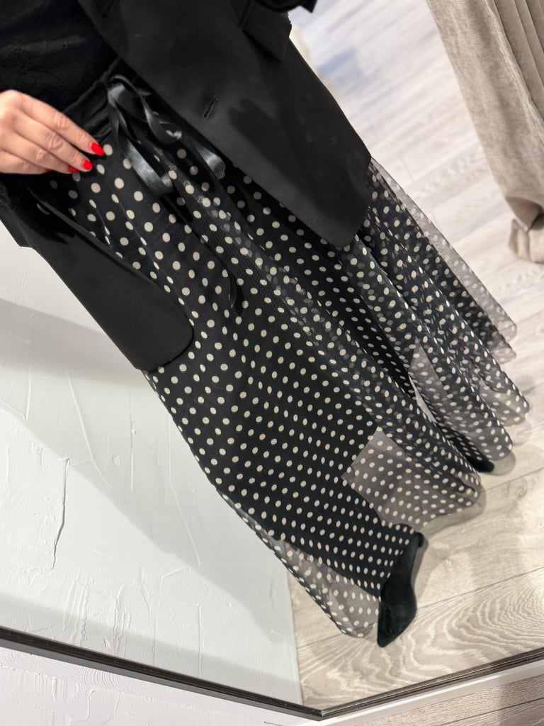 BESKRIVELSE: Skøn nederdel i tyl-stof med elastik i taljen og for, så den ikke er gennemsigtig. Nederdelen har fine lyse prikker.
