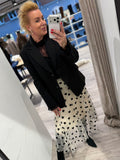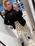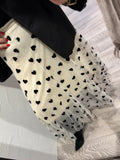 BESKRIVELSE: Skøn nederdel i tyl-stof med elastik i taljen og for, så den ikke er gennemsigtig. Nederdelen har fine sorte hjerter.