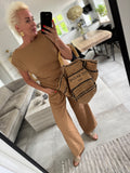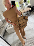 BESKRIVELSE: Super flot sæt med top og buks i mønstret kvalitet. Toppen er med uden ærmer og rund hals. Den har skulderpuder og detaljer. Bukserne har elastik i taljen, lommer i siden og er lige op og ned i modellen.