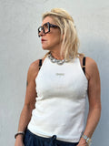 BESKRIVELSE: Tank top i lækker rib kvalitet med guld logo på front.