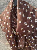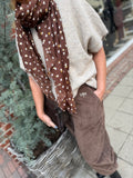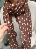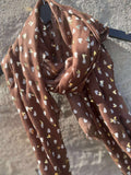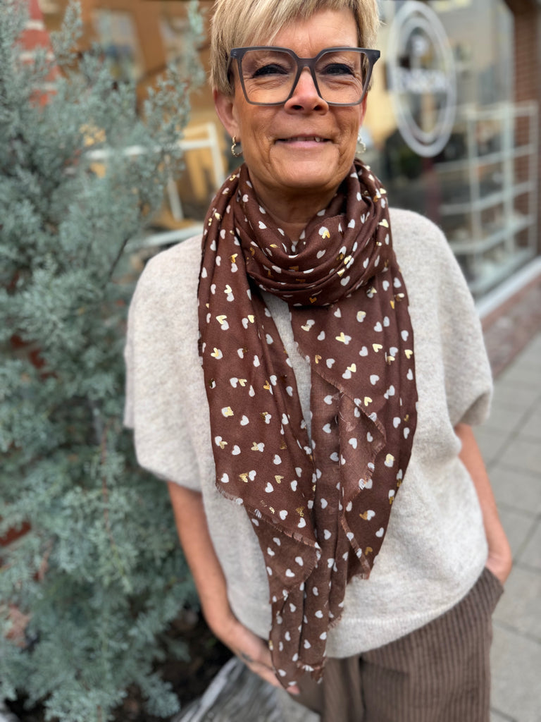 BESKRIVELSE: Aflangt tørklæde i blød kvalitet. Tørklædet er brun i bunden med små gud og hvide hjerter