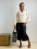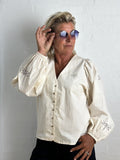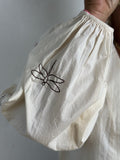 Modellen har ballonærmer, med elastik i enden og med guldsmed broderet på ærmerne.