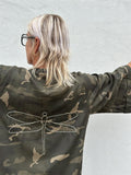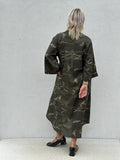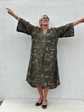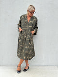 BESKRIVELSE: Fin camouflagefarvet kjole i super længde, med v-udskæring på front.
