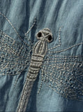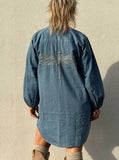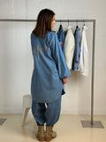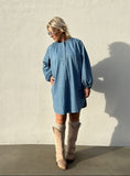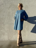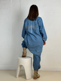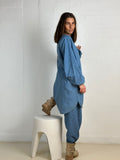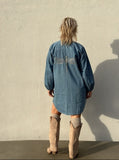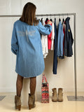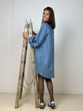 BESKRIVELSE: Super smart tunika eller kort kjole, der går til over knæet, selvfølge alt efter hvor høj man er. Det er en let denim kvalitet. Den har guldsmeden på ryggen.