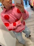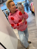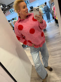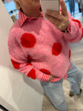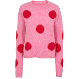 BESKRIVELSE: Smart langærmet strik med prikker i flot rød farve, og med bundfarve i pink. Strikken har rund hals.