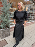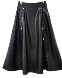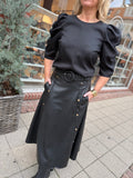BESKRIVELSE: Super flot rundskåret nederdel i fake leather. Der er lynlås i siden og dejligt eftergiveligt materiale. Føles ikke stram. Den har lommer i siderne foran. Alt hardware er guldfarvet.