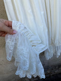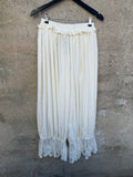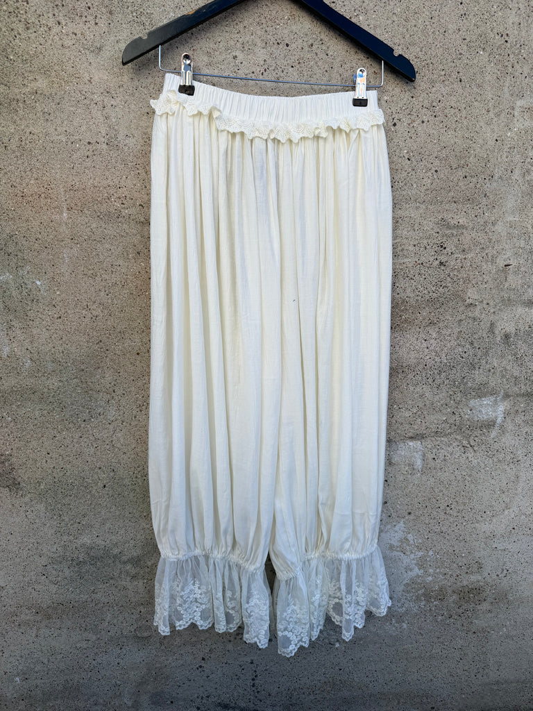 BESKRIVELSE: Smarte bukser med blonde, også kaldet mamelukker. De har elastik i taljen og mange blonde og flæsedetaljer. De har meget vidde, men er normale i taljen.