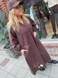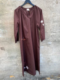 BESKRIVELSE: Lækker kjole med lækre detaljer. Den har 7/8 lange ærmer og er længere bag til. Der er broderinger på kjolen med firkløvere og hestesko, så det er en lykkebringende kjole.