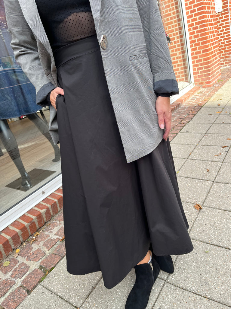 BESKRIVELSE: Smart nederdel med elastik i taljen, lommer i siden og vidde. Den er lavet i let bomuldspoplin.