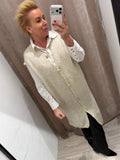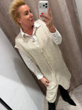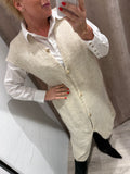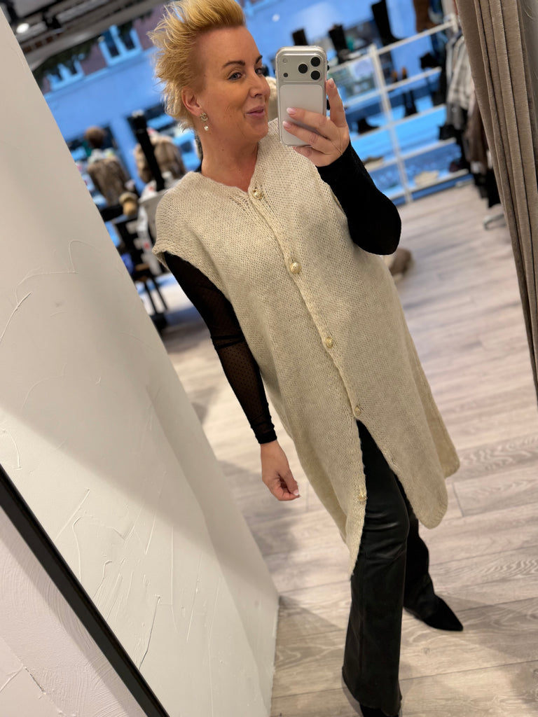 BESKRIVELSE: Lækker lang vest med rund hals og lukkes med guldfarvede knapper foran. Kan bruge både lukket og åben.